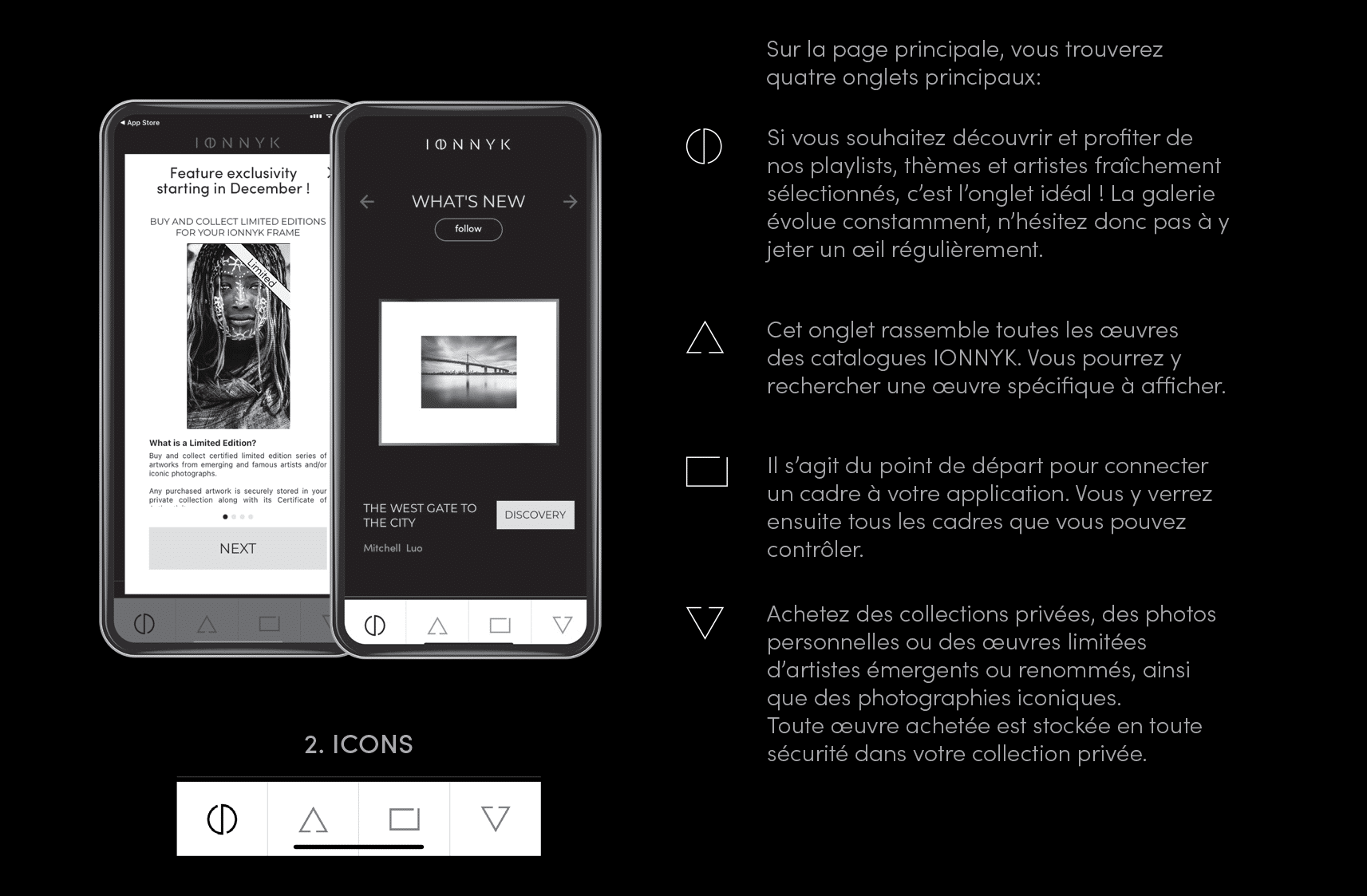 Ouvrez ensuite votre application IONNYK, allez dans l’onglet “Cadre”, puis appuyez sur le bouton “+” pour lancer la procédure d’appairage. Il vous suffit ensuite de suivre les instructions affichées dans l’application.